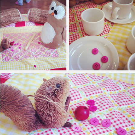 the bee has been having a lot of pretend picnics lately. she got her hands on some pink buttons, and has been feeding all of her friends “pink button bread”. she told me that these guys were squirrel nutkin and old brown! it’s nice to see those two getting along.